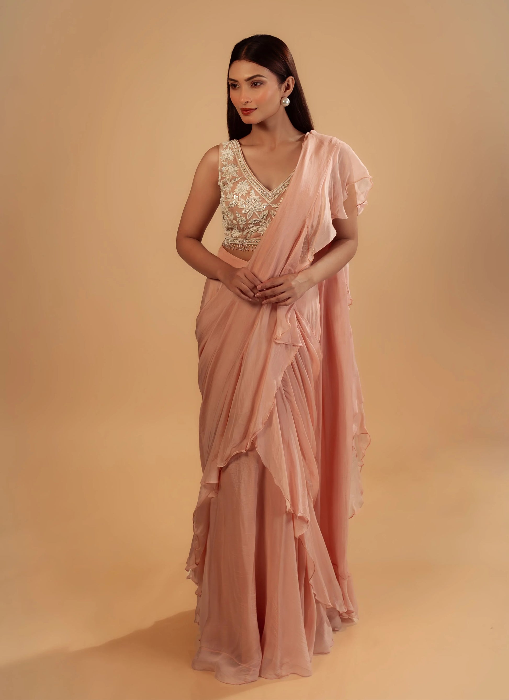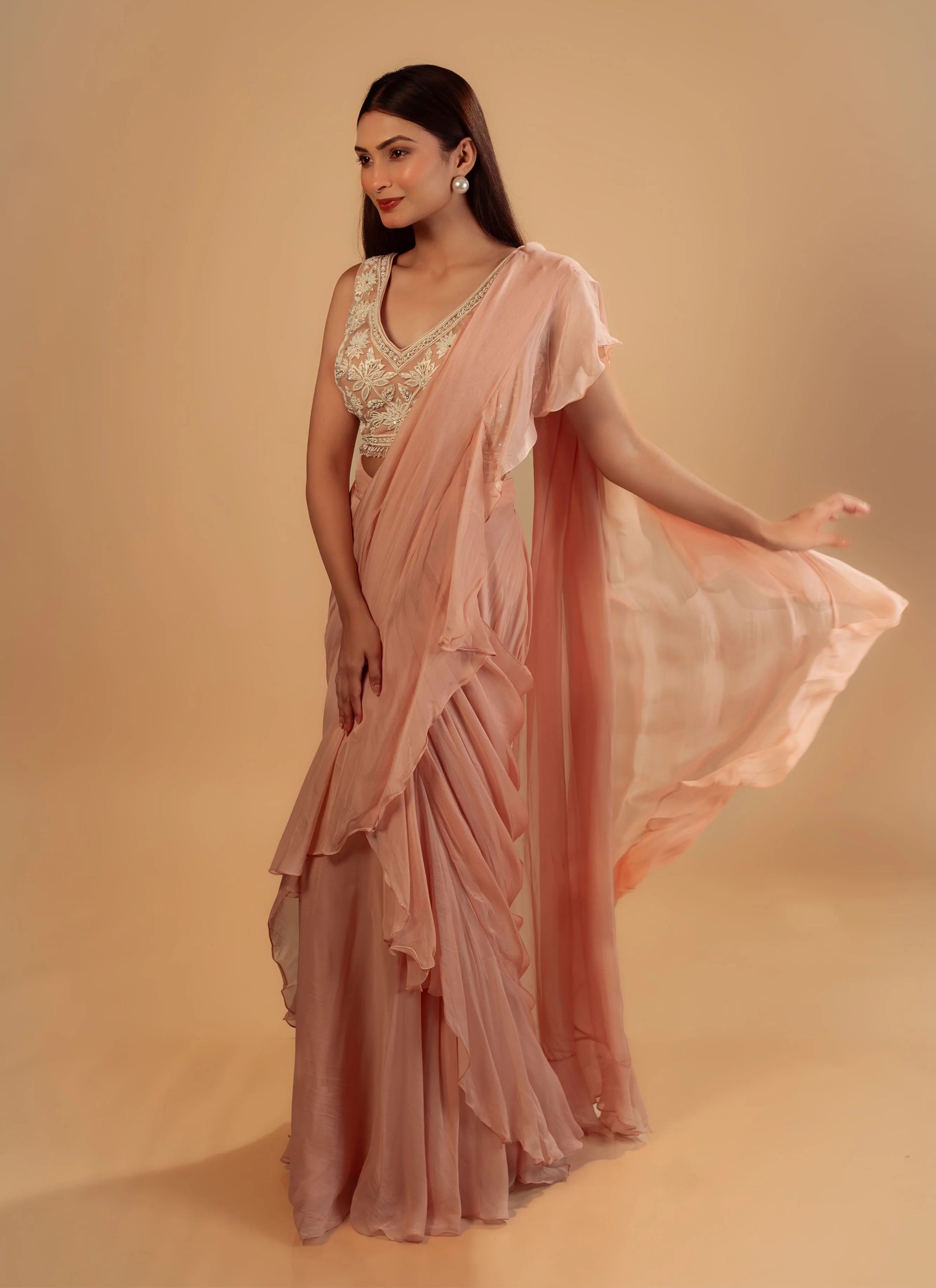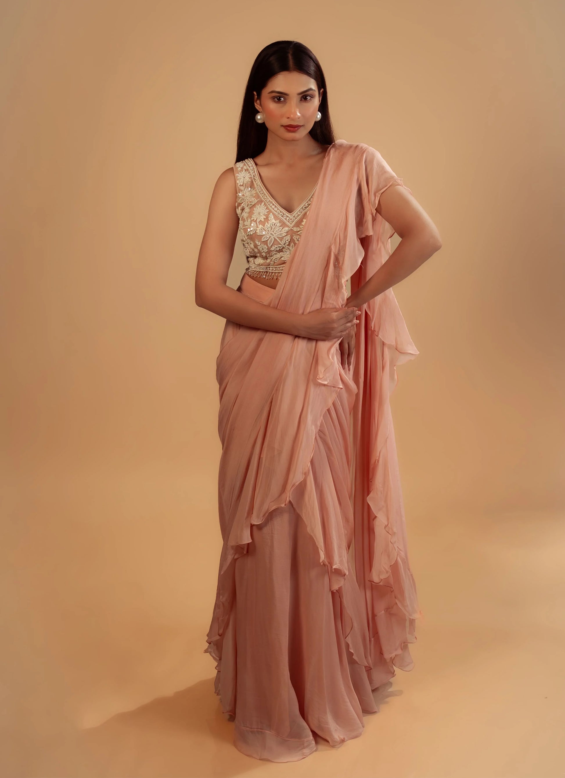 Hand Embroidery Light Pink Drape Saree With Heavy Blouse