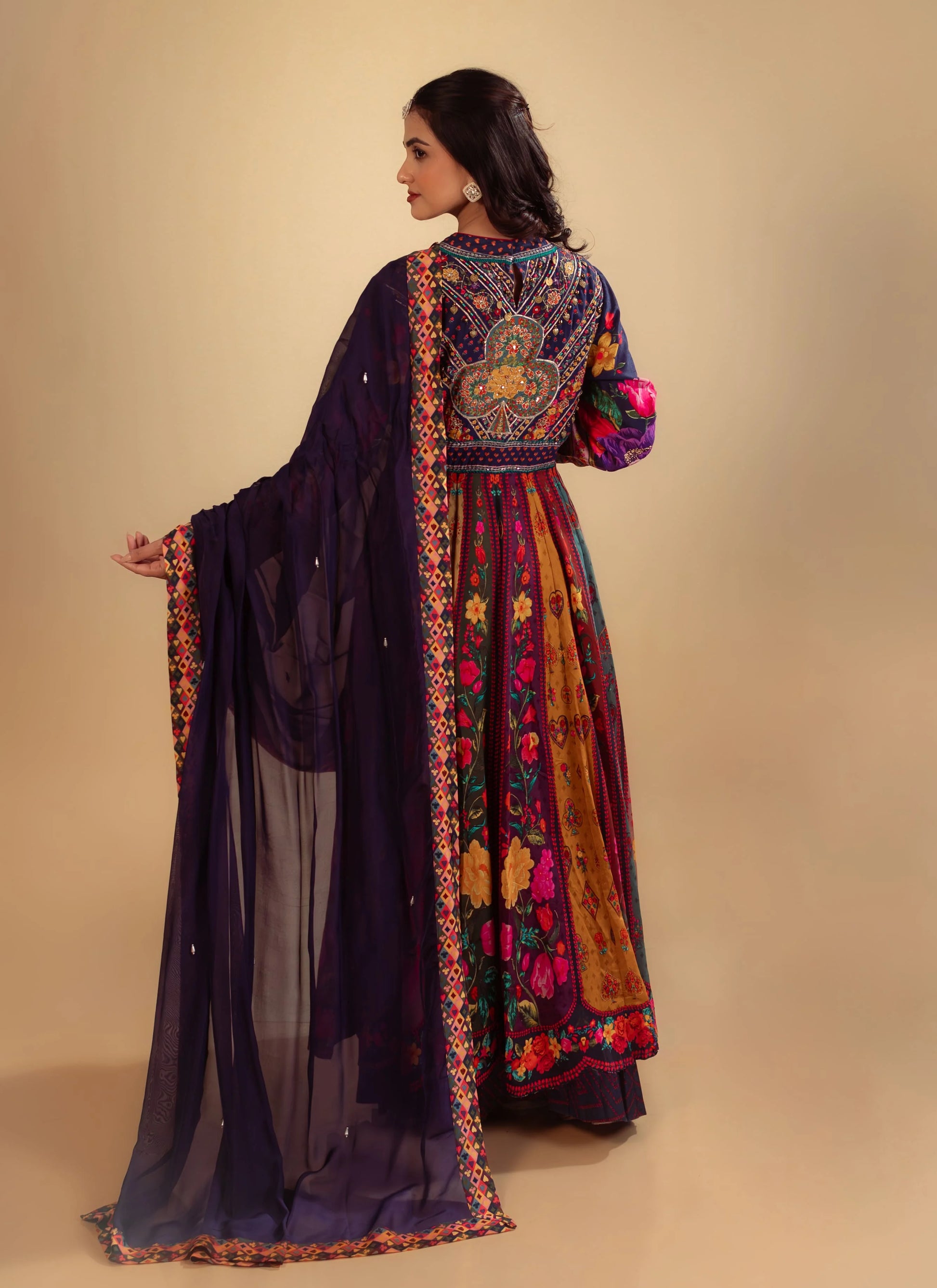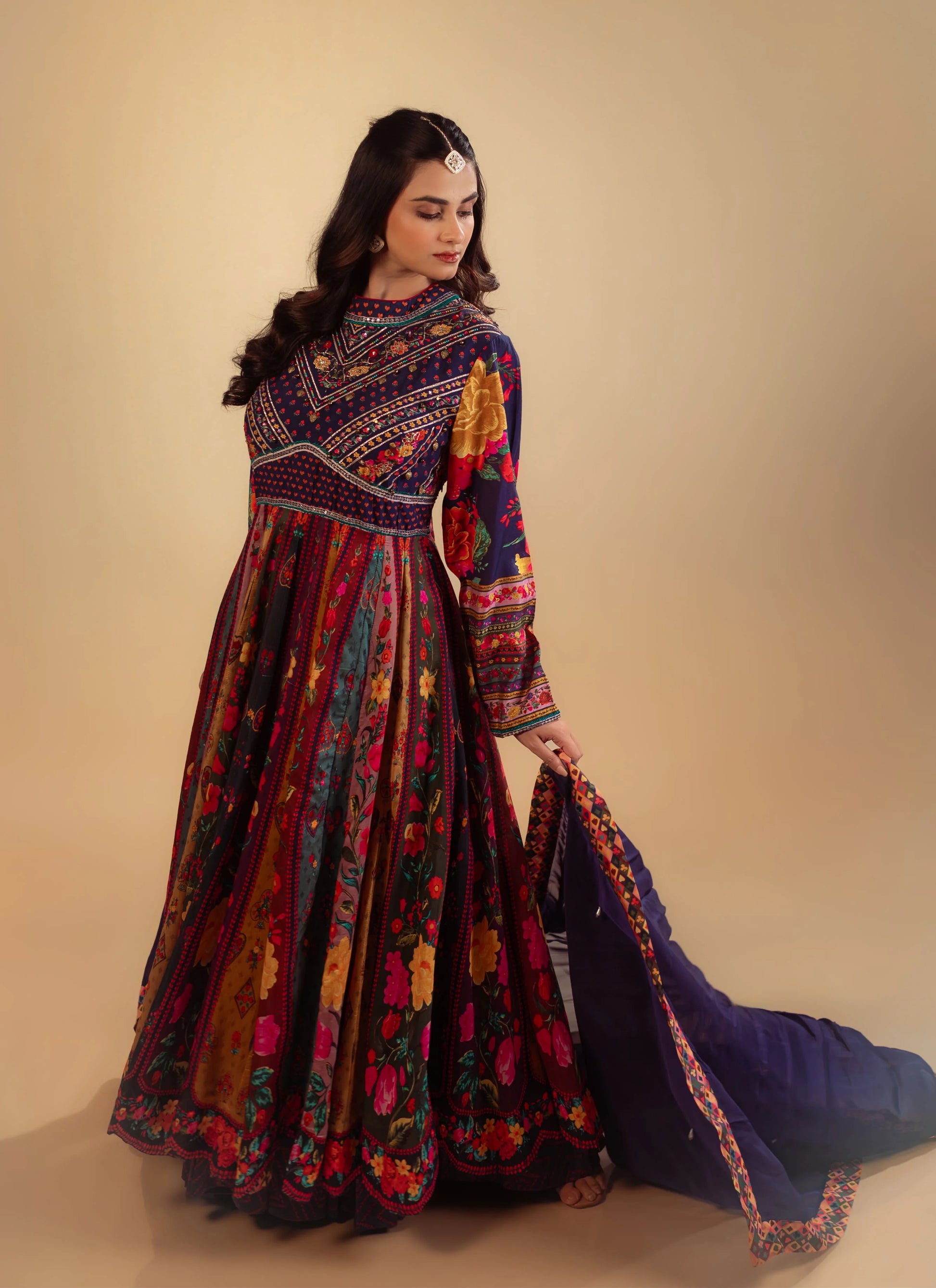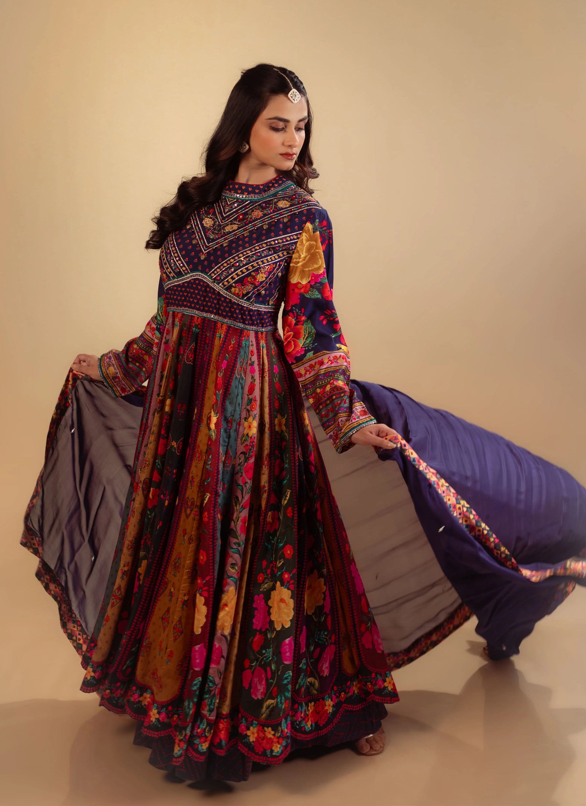 A timeless printed Anarkali featuring vibrant motifs and a fluttering flare. The flowy silhouette combines comfort and sophistication. It’s perfect for festive celebrations.