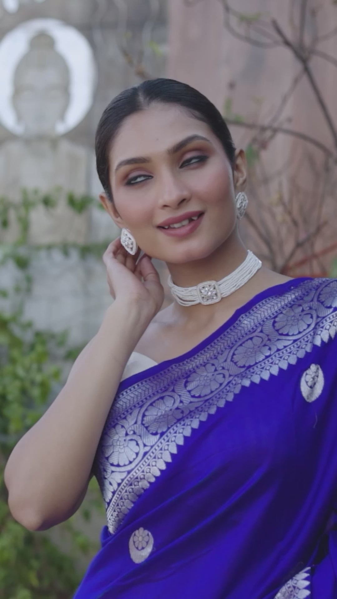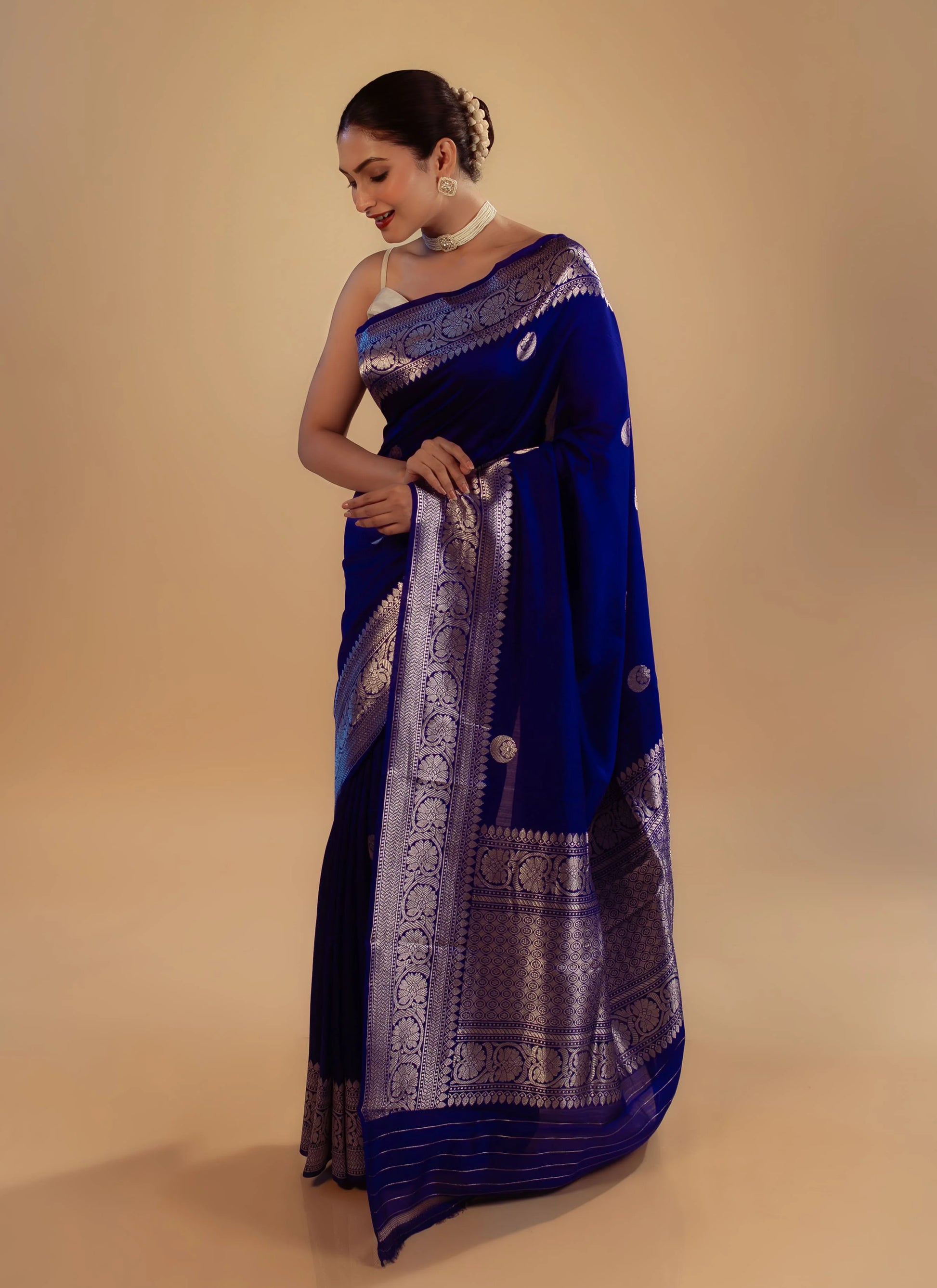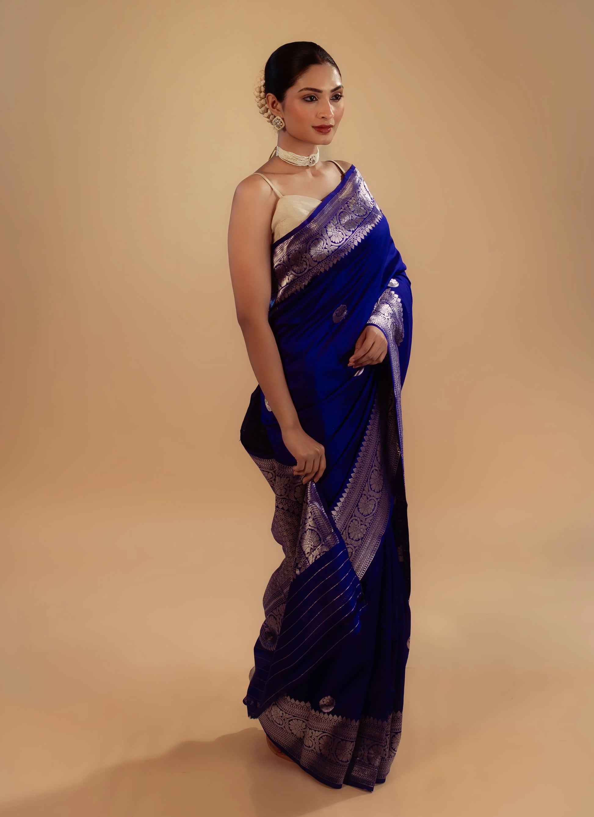 Our handwoven royal blue pure Katan silk saree with Chand Bali Kawa Buta, woven in silver zari, is lightweight, fluid, and perfect for festive celebrations or special occasions. Designed for the modern muse.