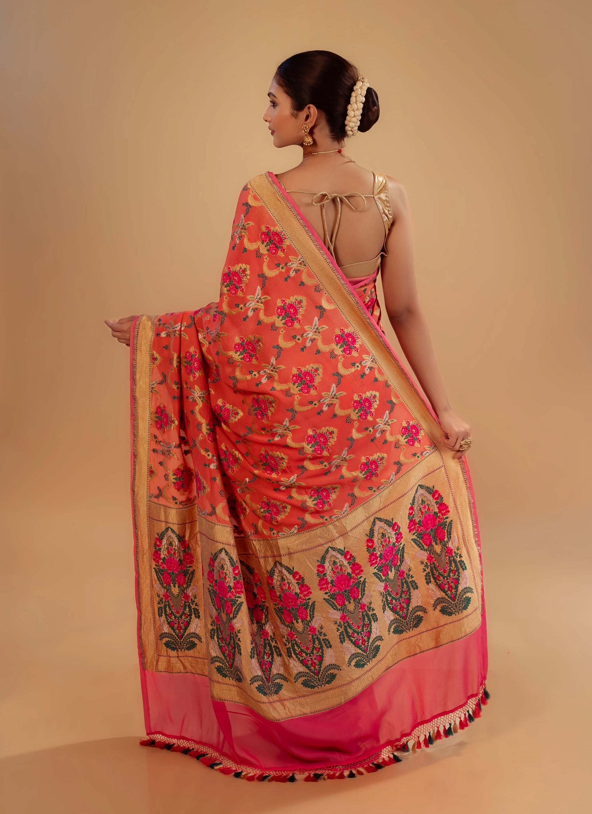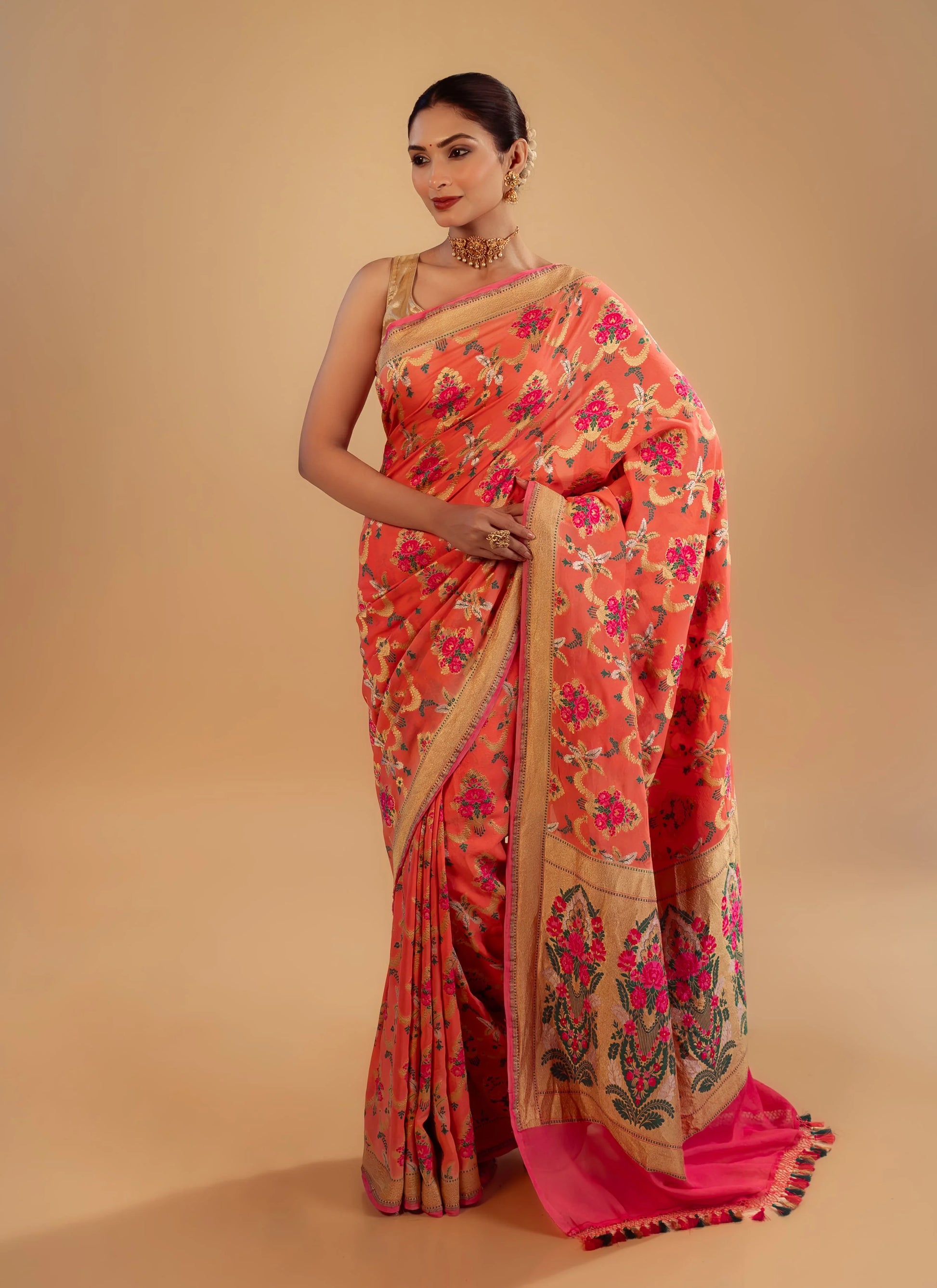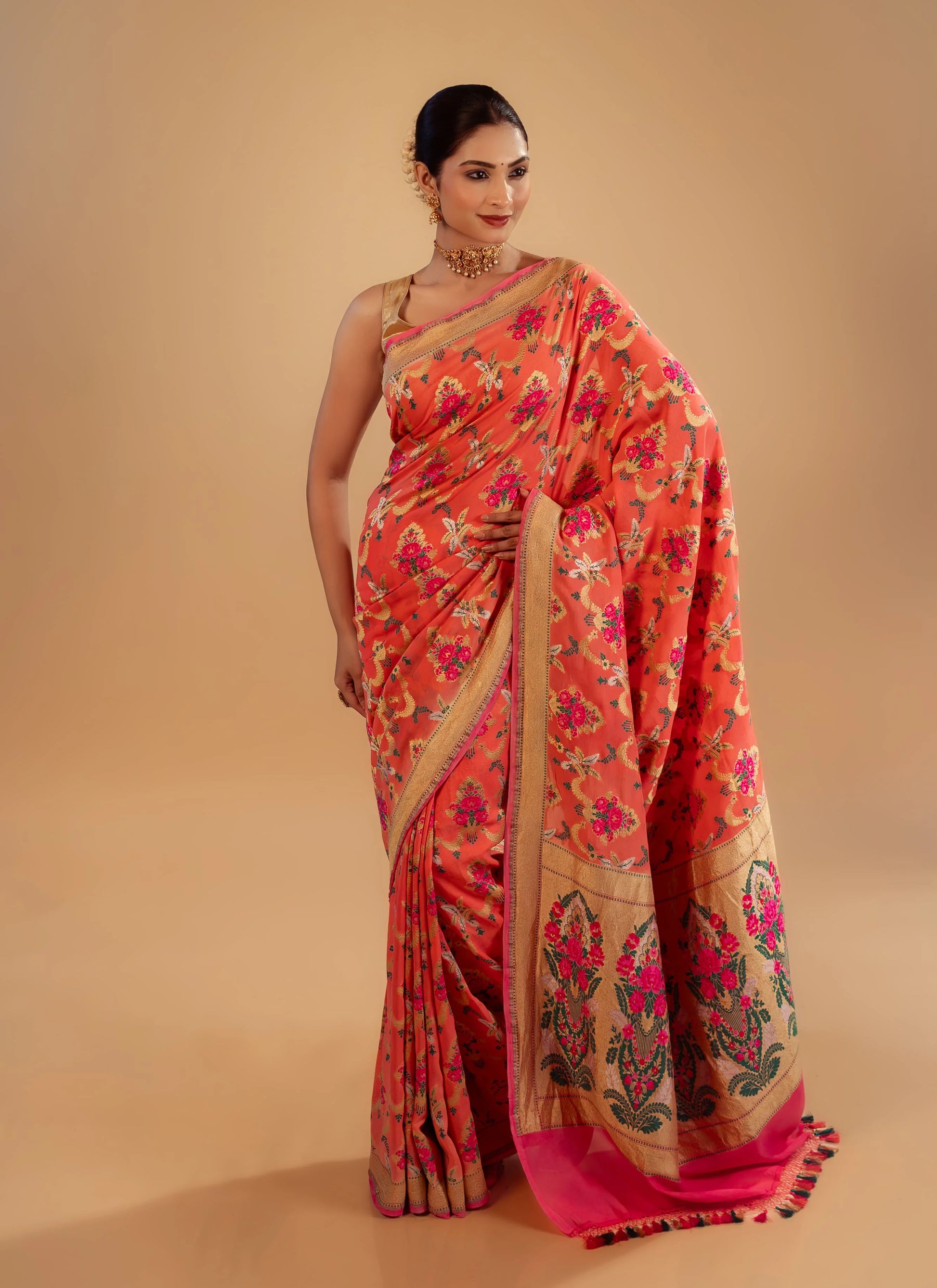 Indulge in the timeless luxury of Banarasi craftsmanship with our Peach Kimkhab saree, woven in pure silk and richly interlaced with metallic zari threads. This saree exudes opulence and grandeur. Known as the “fabric of kings,” Kimkhab is celebrated for its intricate brocade patterns, rich texture, and royal charm, making it a treasured piece in every trousseau.