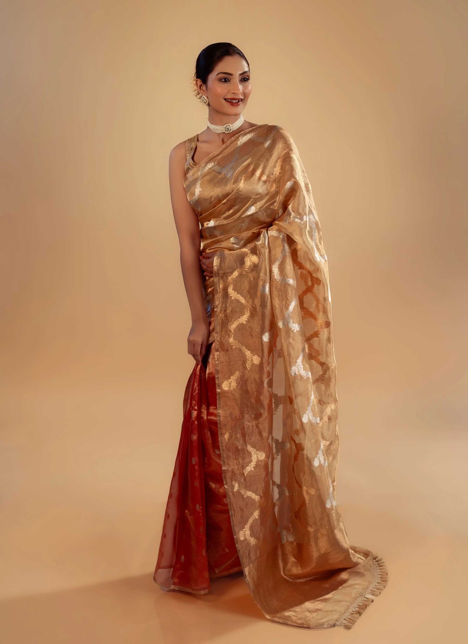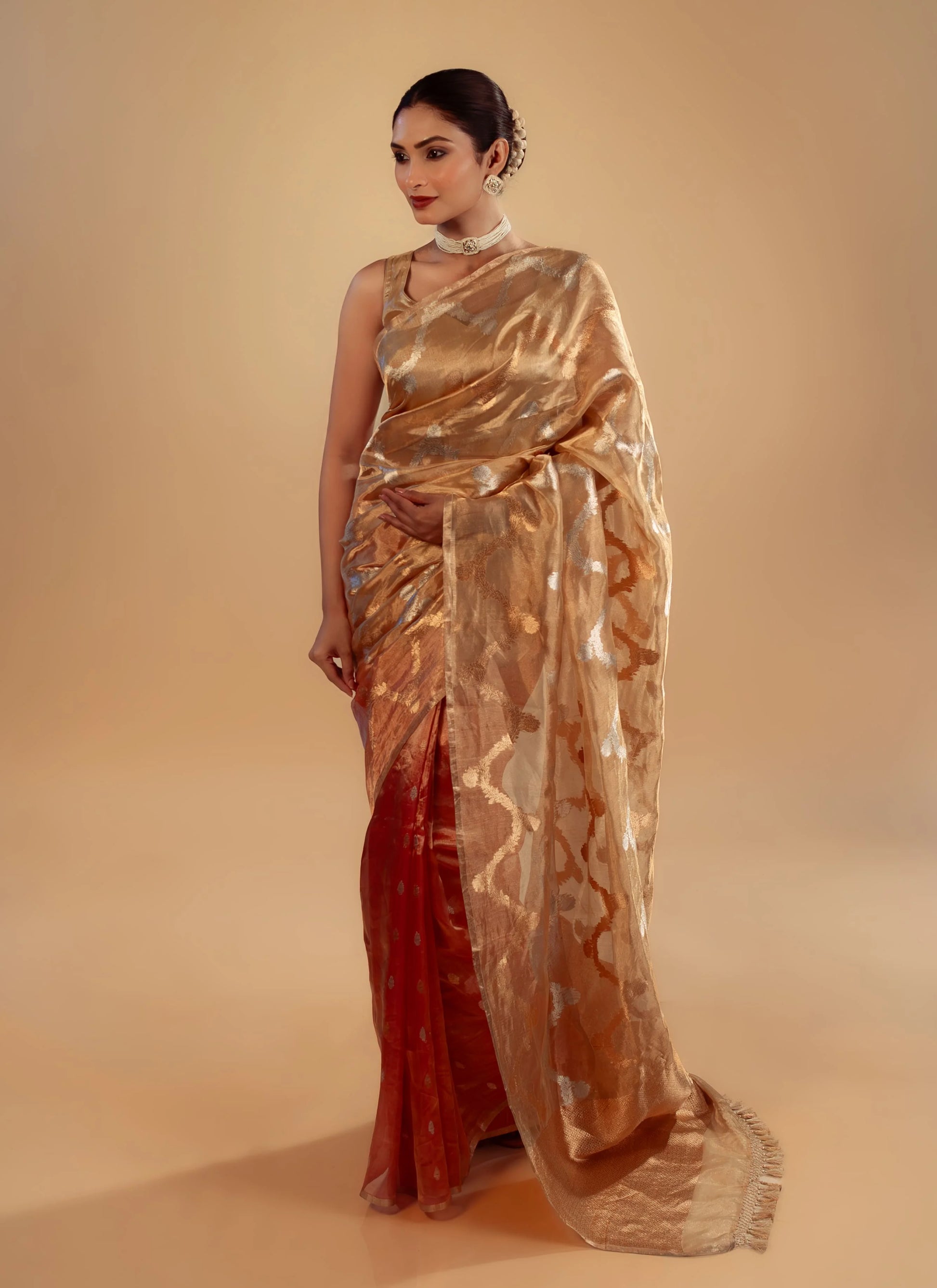 Indulge in our tissue saree featuring delicate gold zari jaal work, blending versatility and drapeability for all seasons. Lightweight in feel, it makes a perfect pick for any celebration.